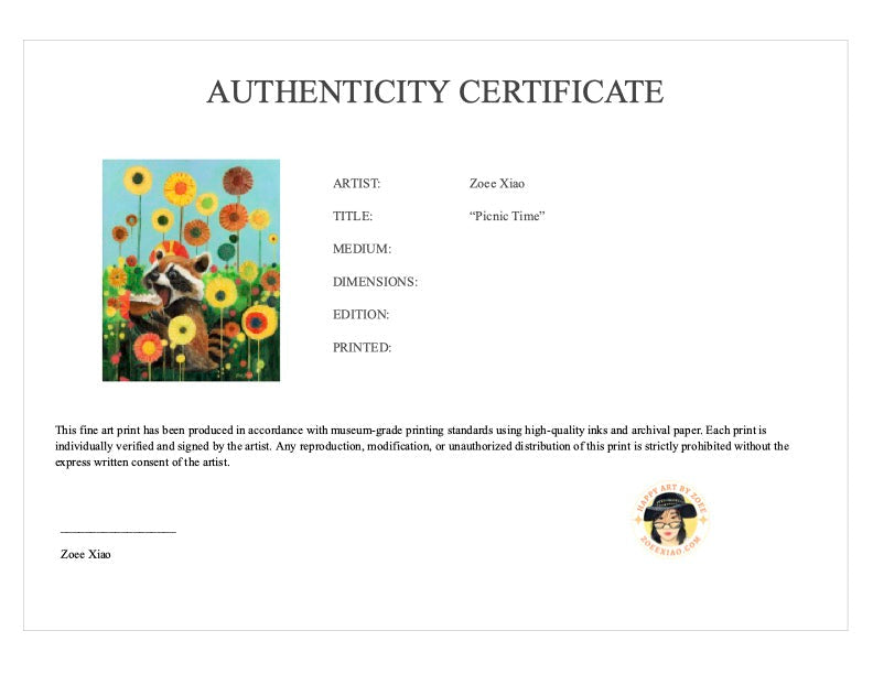 "PICNIC TIME", limited edition fine art prints from Zoee Xiao Artworks. This fine art print has been produced in accordance with museum-grade printing standards using high-quality inks and archival paper/canvas. Each print is individually verified and signed by the artist, comes with its own authenticity certificate.
