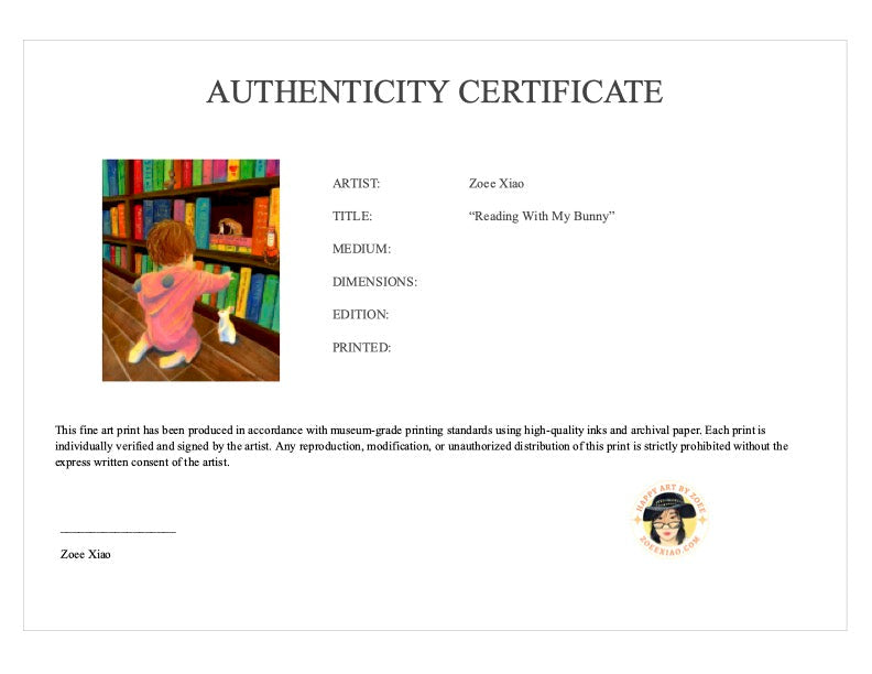 "READING WITH MY BUNNY", limited edition fine art prints from Zoee Xiao Artworks. This fine art print has been produced in accordance with museum-grade printing standards using high-quality inks and archival paper/canvas. Each print is individually verified and signed by the artist, comes with its own authenticity certificate.